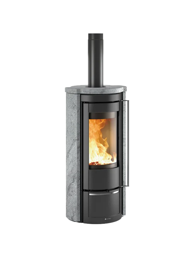 Der komfortable, ergonomische Griff, die stilvolle Kachelverkleidung und der großzügige, feuerfeste Feuerraum von Nordiker mit der großen, gebogenen Panoramascheibe sind einige der Details, die diesen Ofen zu einem eleganten und praktischen Blickfang in Ihrem Zuhause machen.